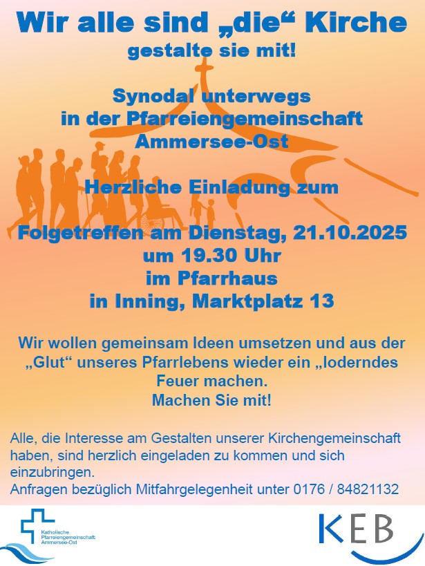 Zu diesem Treffen sind alle herzlich eingeladen, die Lust, Freude und Interesse haben an der Gestaltung unserer Gemeinschaft mitzuwirken. Im Workshop wurden viele Aspekte und Themen genannt, die für unsere Gemeinschaft als wichtig und bedenkenswert erachtet werden. Vieles davon ist bereits Teil unseres Gemeindelebens. Wir möchten gemeinsam die gesammelten Ideen und unsere vielfältigen Aktivitäten betrachten und aktiv werden, so dass wir die "Glut" unseres Gemeindelebens wieder zu einem "lodernden Feuer" entzünden. Im Rahmen der Umsetzungsphase der Weltsynode werden wir - alle Getauften - mit unseren Fähigkeiten und Gaben explizit angesprochen und motiviert am synodalen Prozess unserer Gemeinschaft teilzuhaben.