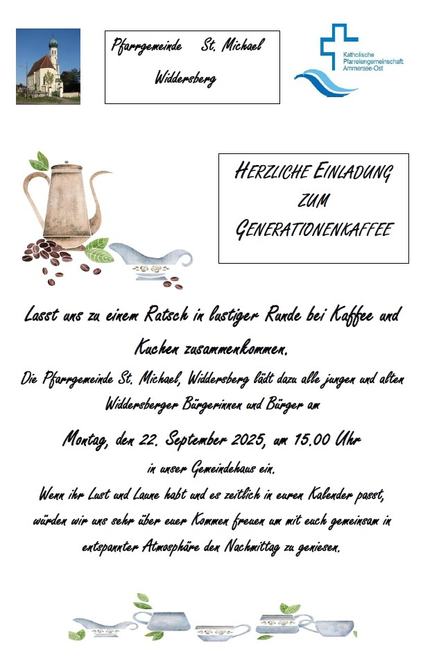 Der Pfarrgemeinderat Widdersberg lädt am Montag, 22. September 2025 um 15.00 Uhr zum Generationen-Café ins Gemeindehaus Widdersberg (Dorfstraße 24, 82211 Herrsching). Neben Kaffee und Kuchen sollen Ratsch und Austausch unterschiedliche Generationen der Widdersberger Bürgerinnen und Bürger zusammenführen – also kein klassischer Seniorennachmittag oder Mutter-Kind-Gruppe, alle sind willkommen – auch Nicht-Widdersberger!