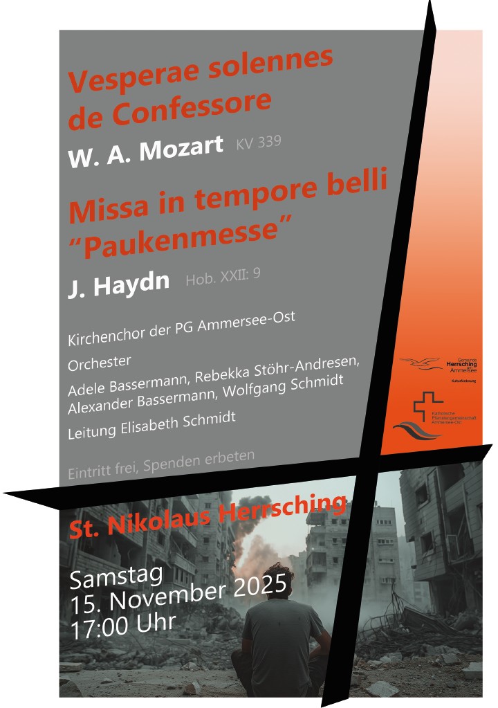 Der Chor der Pfarreiengemeinschaft Ammersee-Ost bringt am Samstag, 15. November 2025 um 17.00 Uhr in St. Nikolaus in Herrsching ein Kirchenkonzert zur Aufführung. Zu hören sind Vesperae solennes de confessore von W.A. Mozart und die „Missa in tempore belli“ von Joseph Haydn, auch bekannt als „Paukenmesse“ auf. Weitere Informationen werden über Plakate veröffentlicht.