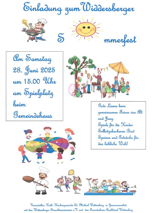 Am Samstag, 28. Juni 2025 ab 15.00 Uhr laden der Pfarrgemeinderat der Filialgemeinde St. Michael, Widdersberg zusammen mit dem Brauchtumsverein und dem Backhäuslverein zum Sommerfest im und ums Gemeindehaus (Dorfstraße 24, Widdersberg) ein. Für Spiel und Spaß, Speis und Trank ist ausreichend gesorgt!